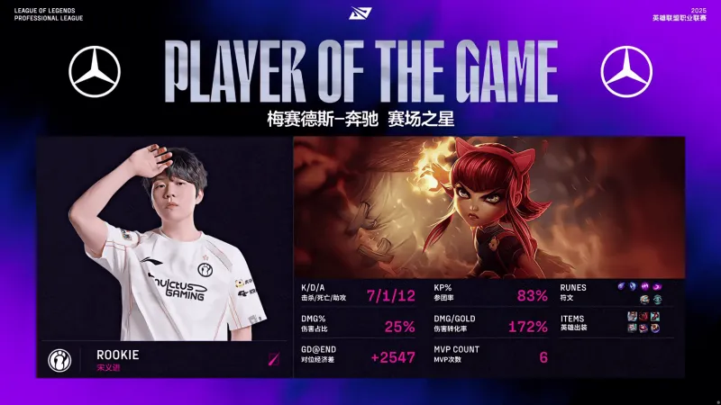 虎扑08月22日讯 在刚刚结束的LPL第三赛段组内赛IG对阵FPX比赛中,Rookie安妮打出7/1/12战绩,拿下IG对阵FPX第一局MVP,这也是他第6个MVP。