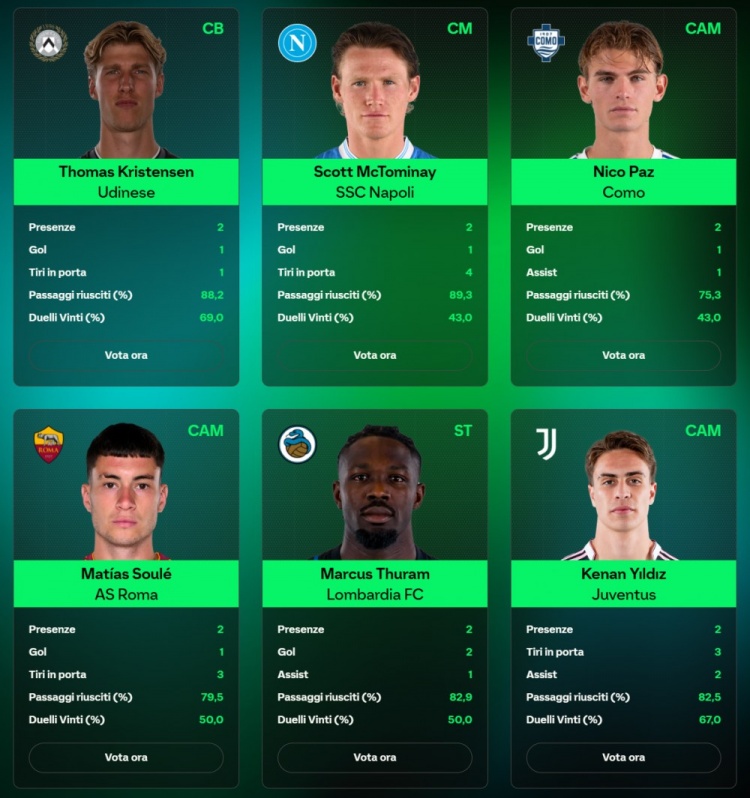 9月4日官方消息,意甲联赛公布8月最佳球员六人候选名单,包括麦克托米奈、小图拉姆、伊尔迪兹、尼科-帕斯、苏莱和托马斯-克里斯滕森。